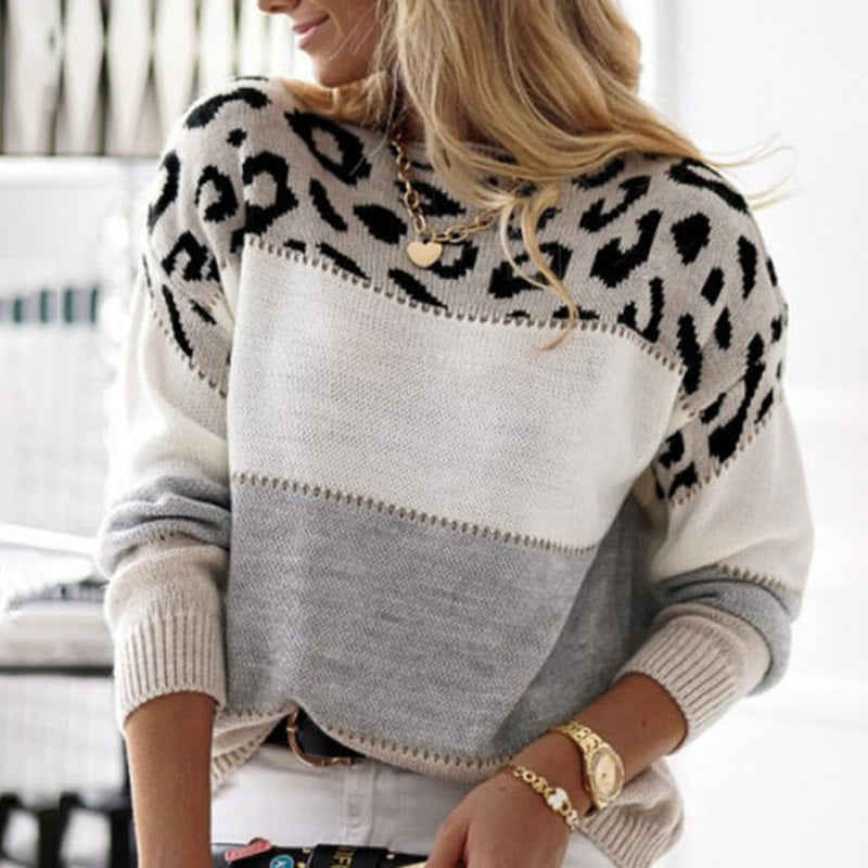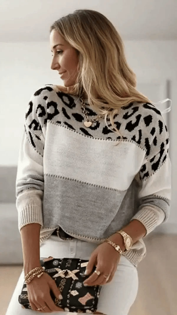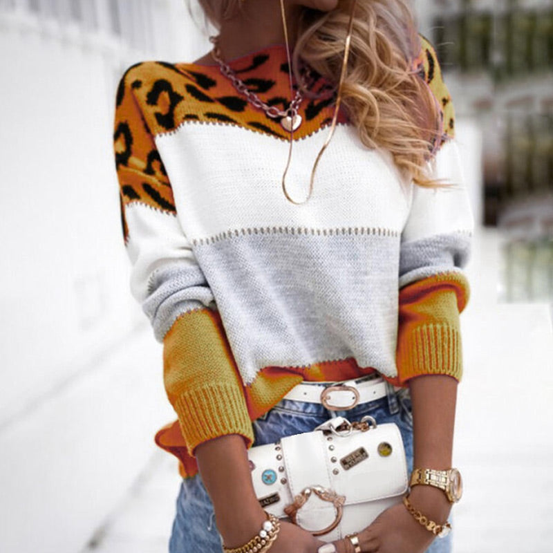 Women's Color Block Leopard Pattern Round Neck Sweater
