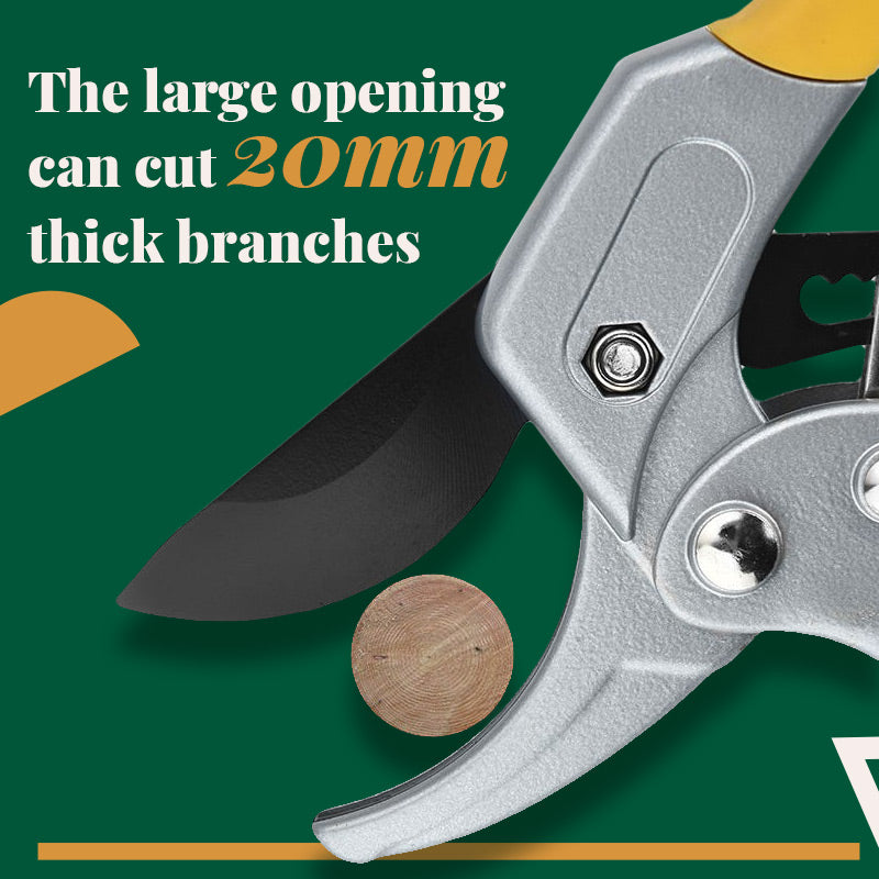 - The stainless steel spring is matched with a professional segmented lever labor-saving design, and the sharing force is increased by 3 times. Large opening can cut 20mm thick branches, relieving hand fatigue and soreness.